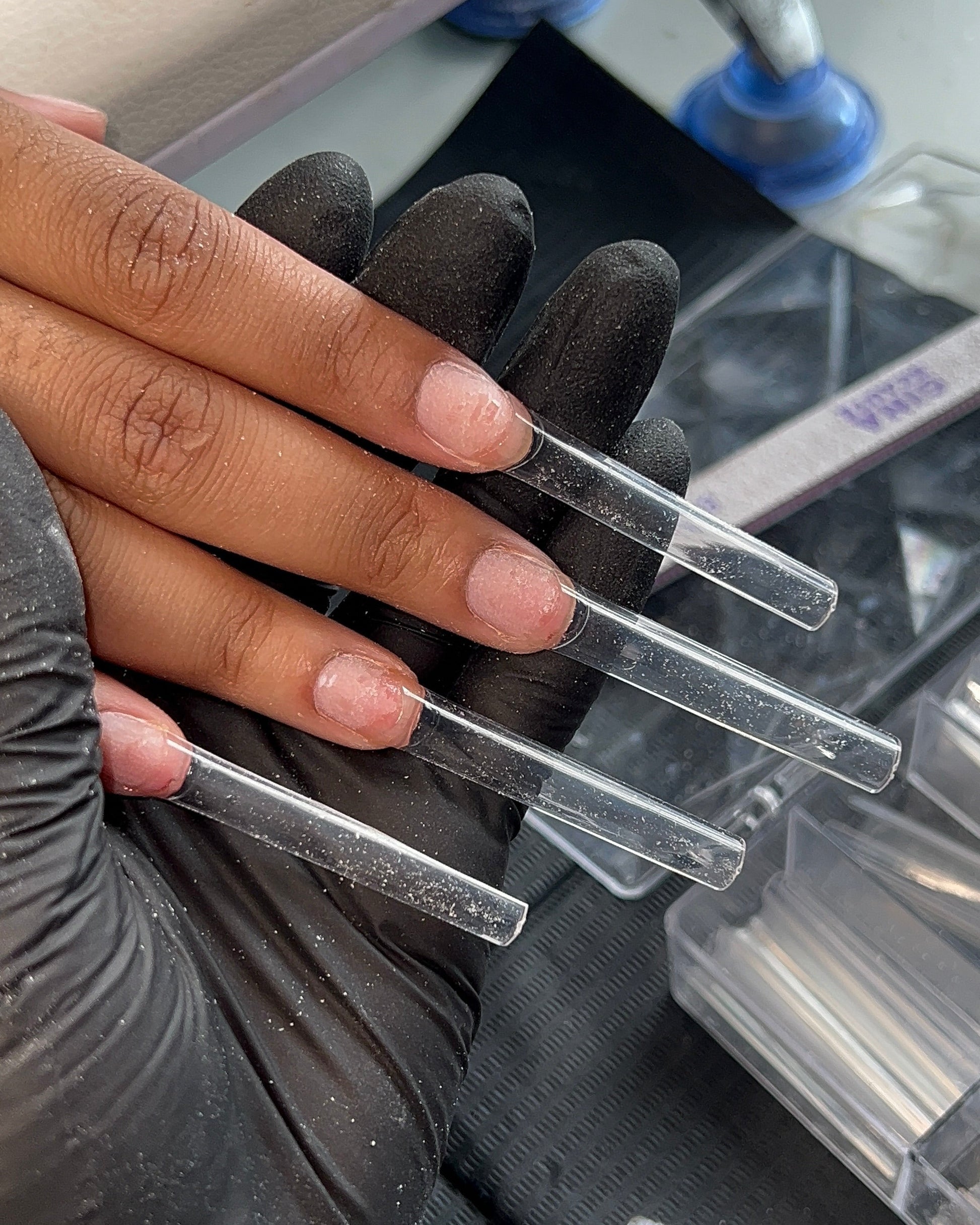 In the past, a lot of nail techs used curved nail tips, but I realized that pre-shaped nail tips are a total game-changer. They save so much time because you don’t have to shape every single one — which means you can take more clients and make more money.